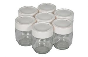 Есть баночки с крышками на которых можно выставить дату изготовления йогурта, хотя как правило, если делается кефирчик деткам, то рекомендуют давать его первые три дня от даты приготовления. Если деток двое то количество банок 7 штук как раз очень удобно и одна банка может использоваться для перезаквашивания.