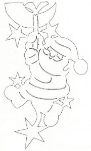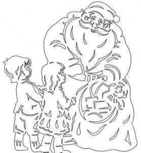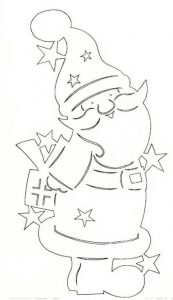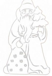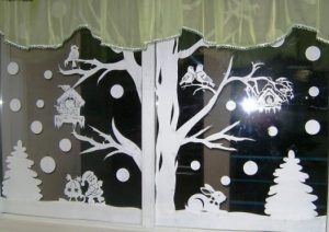 Сначала нужно распечатать на принтере заготовки для вырезания. Если у вас нет копировального устройства, то увеличьте изображение до необходимого размера, приложите лист бумаги к монитору и проведите простым карандашом по контурам. Внешние части вырезаем ножницами, а внутренние или мелкие – канцелярским ножом, предварительно положив шаблон на ровную деревянную поверхность. Старайтесь, чтобы на бумаге не оставались черные линии от контура. Фигурки будут просвечиваться на окне, поэтому нужно удалить лишнюю обводку. Наиболее эстетично будут смотреться белые картинки, но если вы желаете разнообразить композицию, то некоторые детали можно разукрасить карандашами или краской. Приклеить вырезки очень легко. Макайте кисть в теплую воду и натирайте брусок мыла. Этот раствор наносится на заготовку, которую нужно сразу приложить к поверхности стекла, пока она не размокла. Прижимаем бумагу губкой и разгоняем образовавшиеся пузырьки воздуха мягкой тканью. Чтобы снять вытынанки нужно их намочить теплой водой, подождать 3 – 5 минут, чтобы они хорошо пропитались и соскоблить ножом. Если это делать аккуратно, то некоторые фигурки можно использовать в следующем году.
