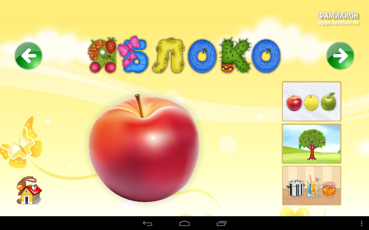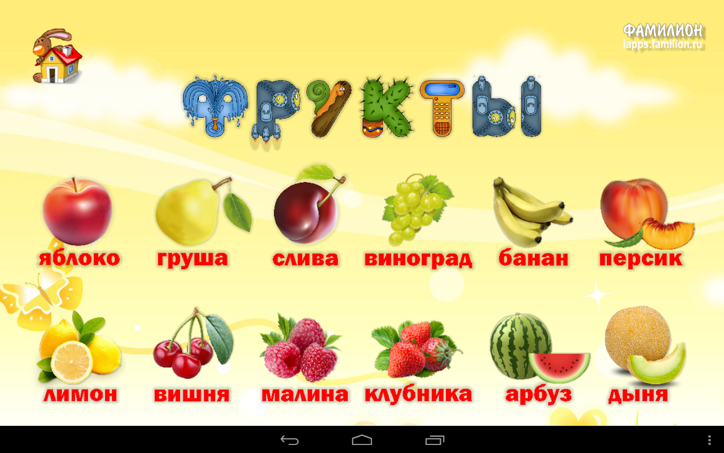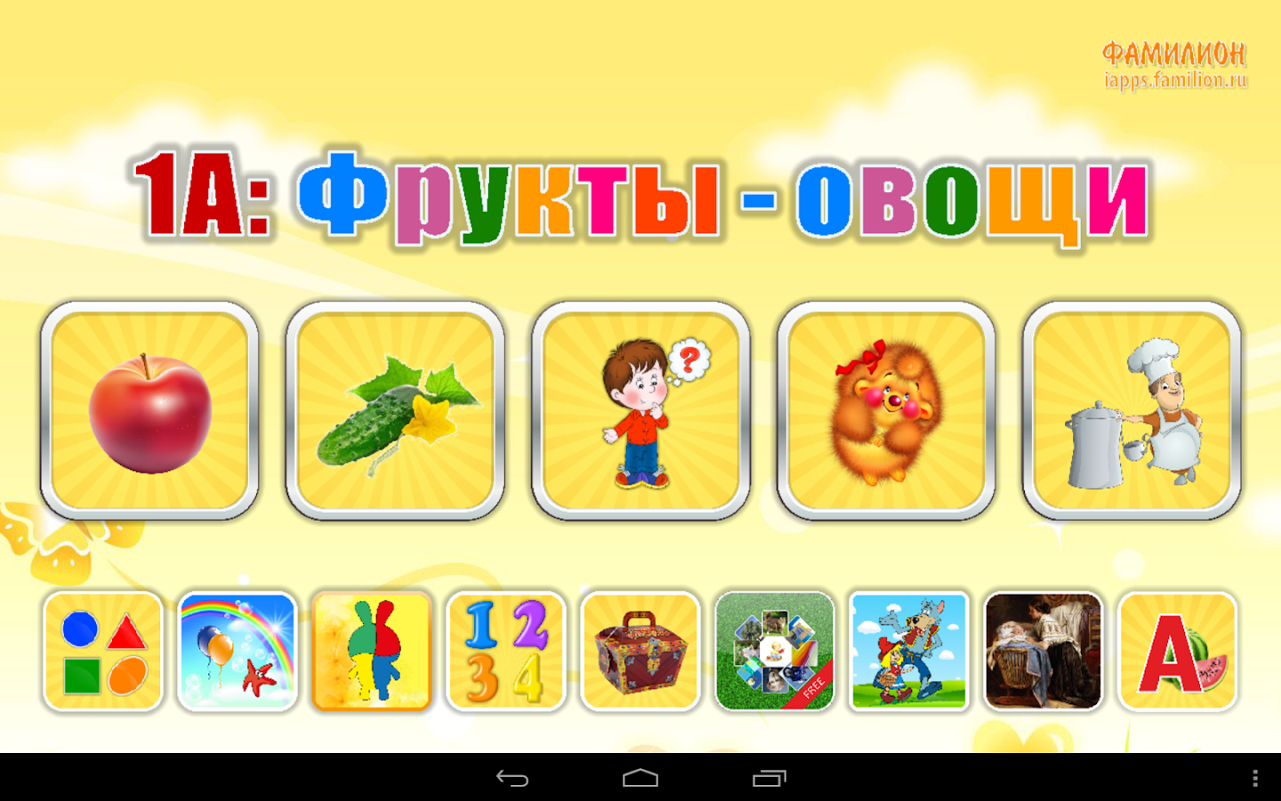 Приложение «1А: Фрукты-овощи» поможет изучить малышам фрукты и овощи. Дети смогут узнать какие именно продукты относятся к фруктам, а какие к овощам, какого бывают цвета, где они растут, какие блюда из них можно приготовить. В игровой форме малыш сможет закрепить полученные знания и просто поиграть — угостить зверюшек их любимыми лакомствами, выбрать для бабушки-повара нужные ингредиенты для распространенных блюд.