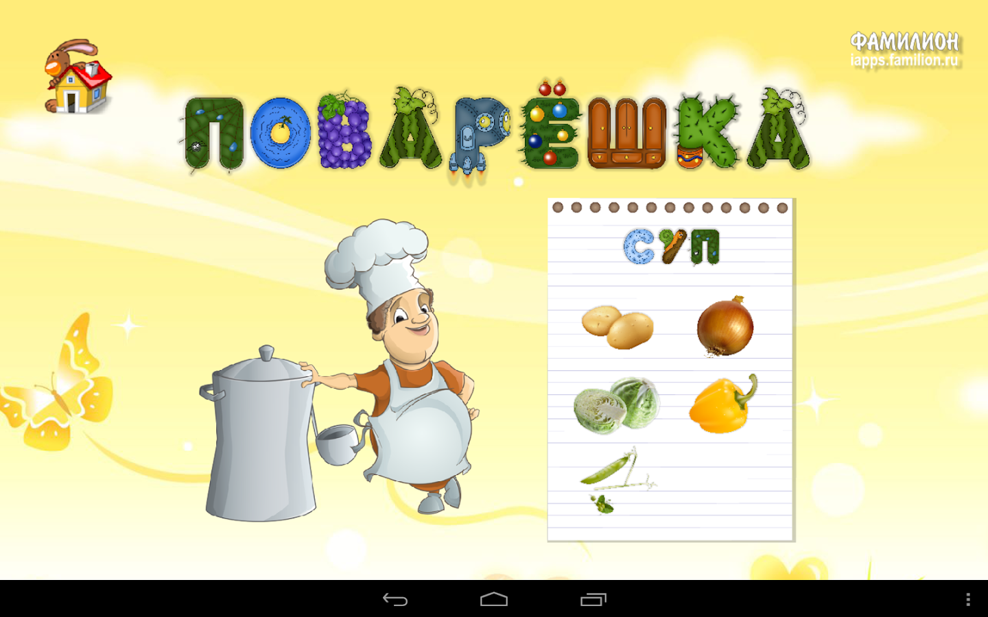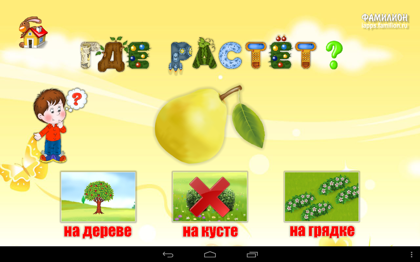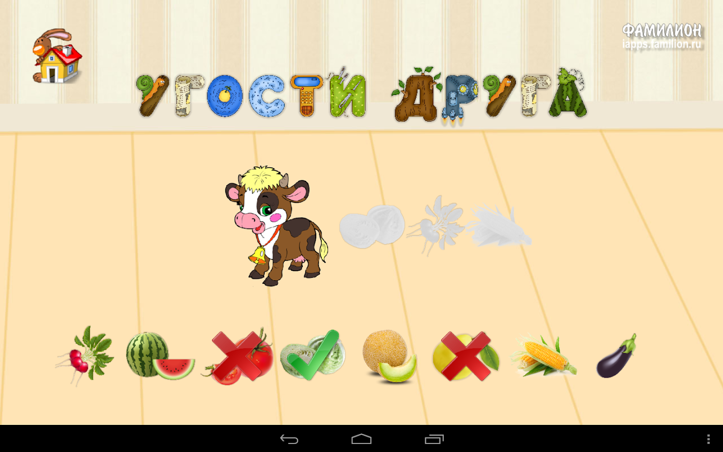 Приложение «1А: Фрукты-овощи» поможет изучить малышам фрукты и овощи. Дети смогут узнать какие именно продукты относятся к фруктам, а какие к овощам, какого бывают цвета, где они растут, какие блюда из них можно приготовить. В игровой форме малыш сможет закрепить полученные знания и просто поиграть — угостить зверюшек их любимыми лакомствами, выбрать для бабушки-повара нужные ингредиенты для распространенных блюд.