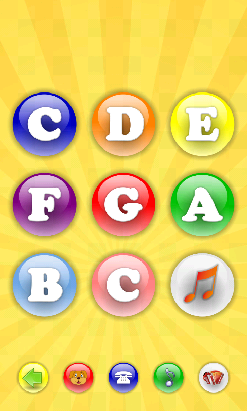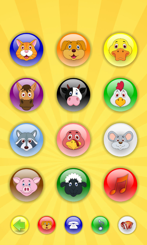 В приложении имеется 4 игровых режима: звуки животных, мобильный телефон, пианино, музыкальные инструменты.