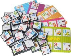 Для изучения алфавита используйте игровые пособия: лото Азбука, домино, кубики.